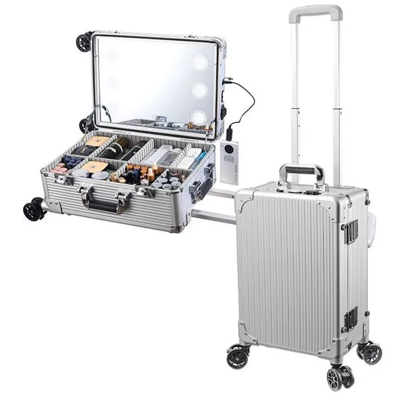 K2065 Professional Bridal LED Makeup Case with Wheels Portable Large Capacity Multi-Compartment Cosmetic Organizer for Wedding Artists