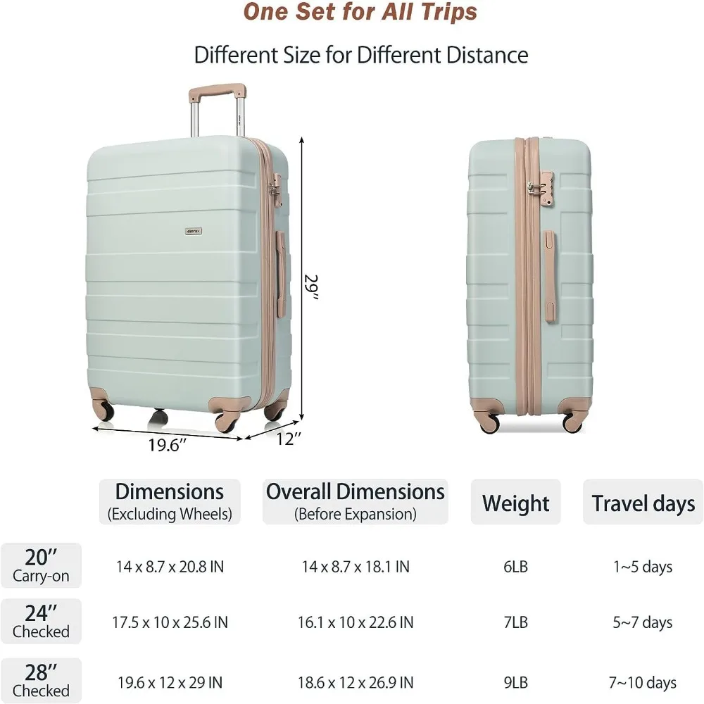 [3 Piece Luggage set] Set includes 20″ carry on (Meets carry-on size restrictions for those traveling domestically and looking to stay light) and 24″/28″ spinners (Maximize your packing power and the ideal checked bags for longer trips). Each set is shipped with each suitcase inside one another to save space for your convenience.