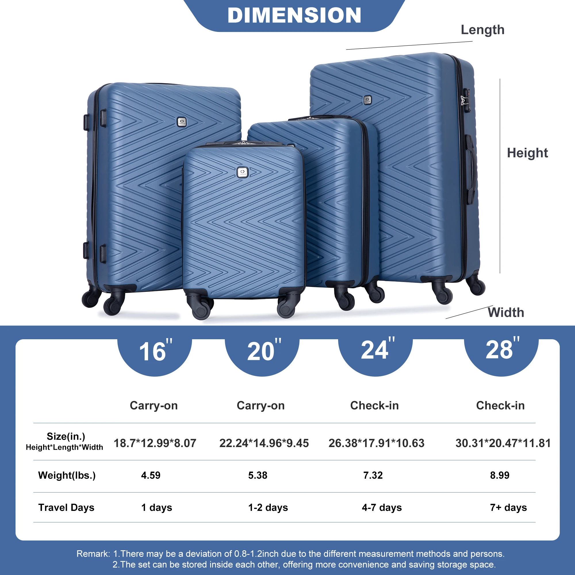 L453 Travelhouse Luggage set 4-Piece ABS Suitcase With Spinner Wheels,24 Inch and 28 Inch with TSA Lock,16,20 inche Carry on Luggage
