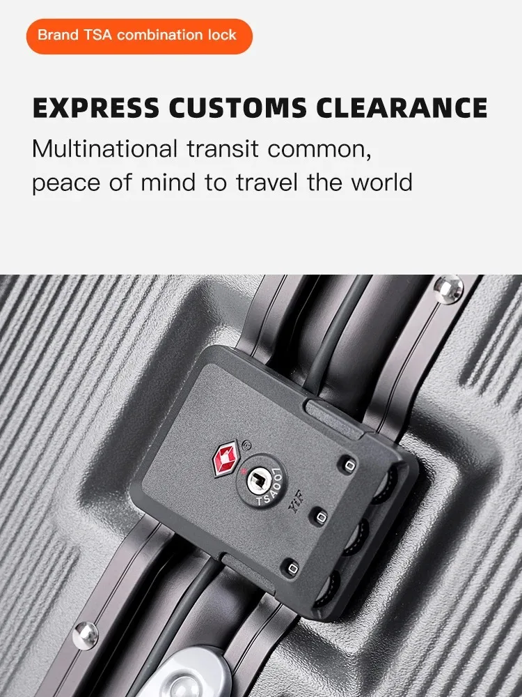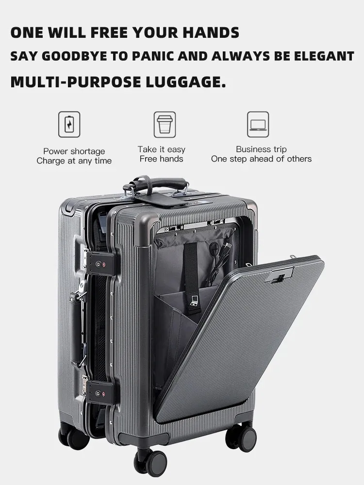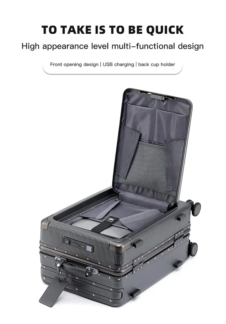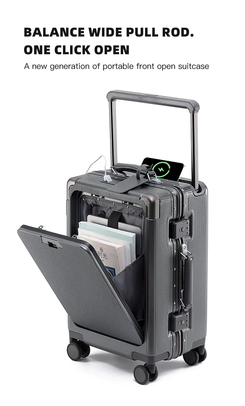 TH086 Aluminum Alloy Frame Suitcase Front Opening Pocket with USB Charging Plug Rolling Luggage TSA Lock Wide Trolley Case with Wheel