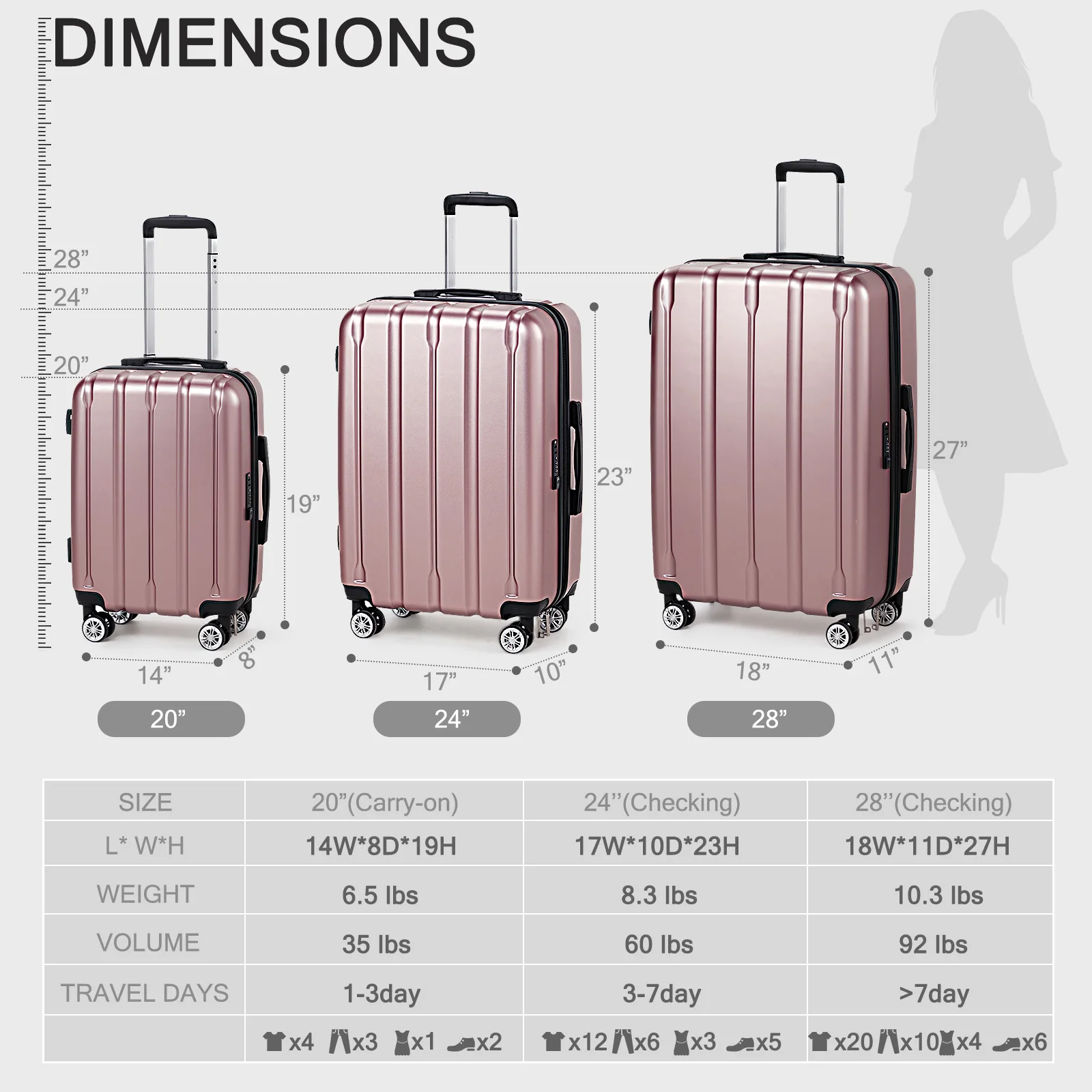 TH123 -in-1 Suitcase Vertical Stripes Trolley Case, Rolling Luggage 20in 24in 28in ABS PC, Fashion Color -rose Gold